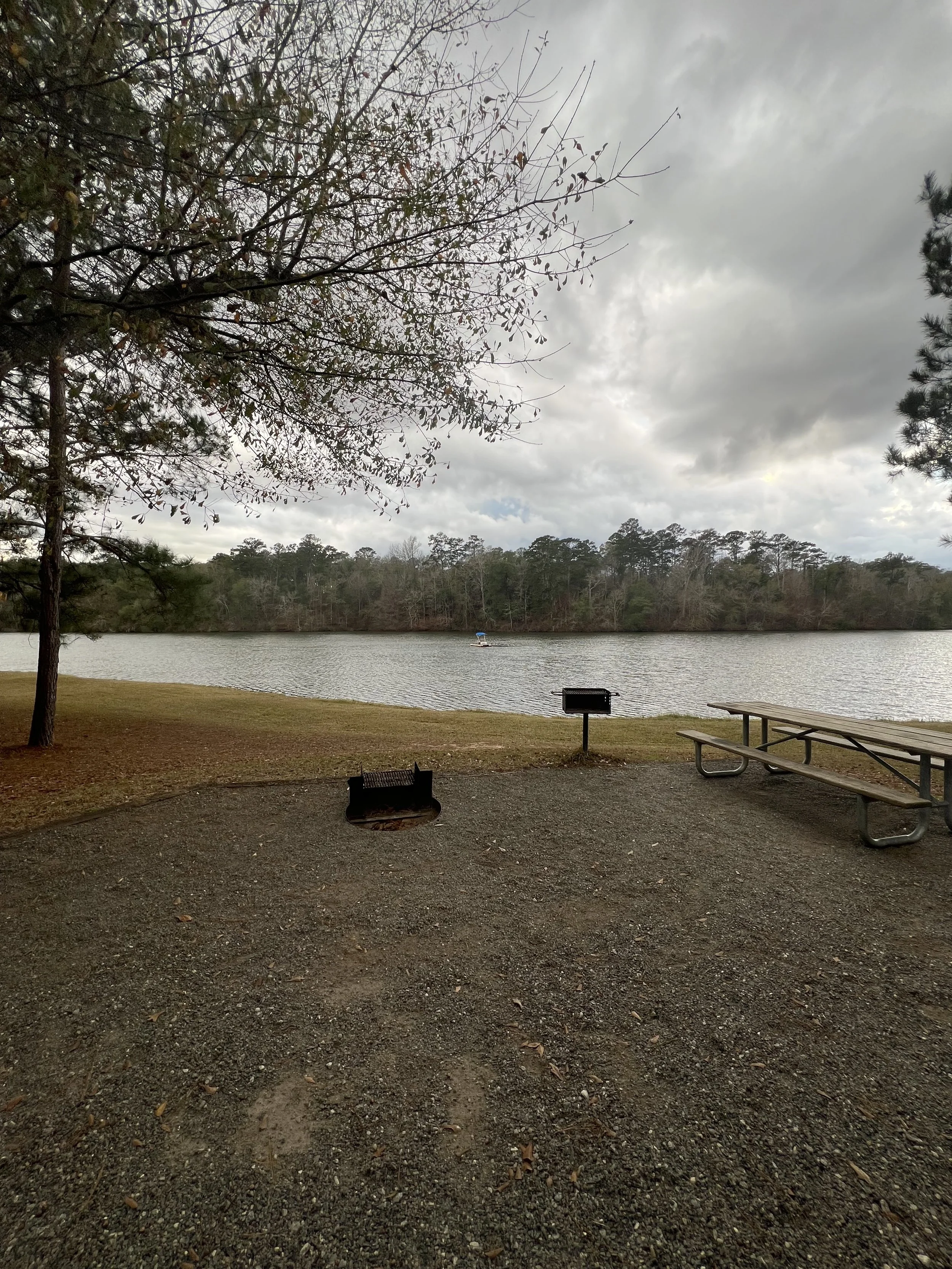 Figment pulled into the campground around 3:30pm. While the park is nearly 200 acres, the campground is small, with only 25 sites, all of which have water and 30 amp electrical hookups. All sites have fire rings, picnic tables and grills. A handful of sites sit on the bank of Lake Kolomoki, which we found to be particularly lovely despite the rapidly-dropping temperature. The bath house is centrally-located and very clean and up to date. There is also a washing machine and dryer for a reasonable cost. After a quick walk around our temporary home, we set up camp and enjoyed our travel-day meal of tomato soup and grilled cheese and after a couple of really cold after-dark dog walks around the campground, settled into bed.